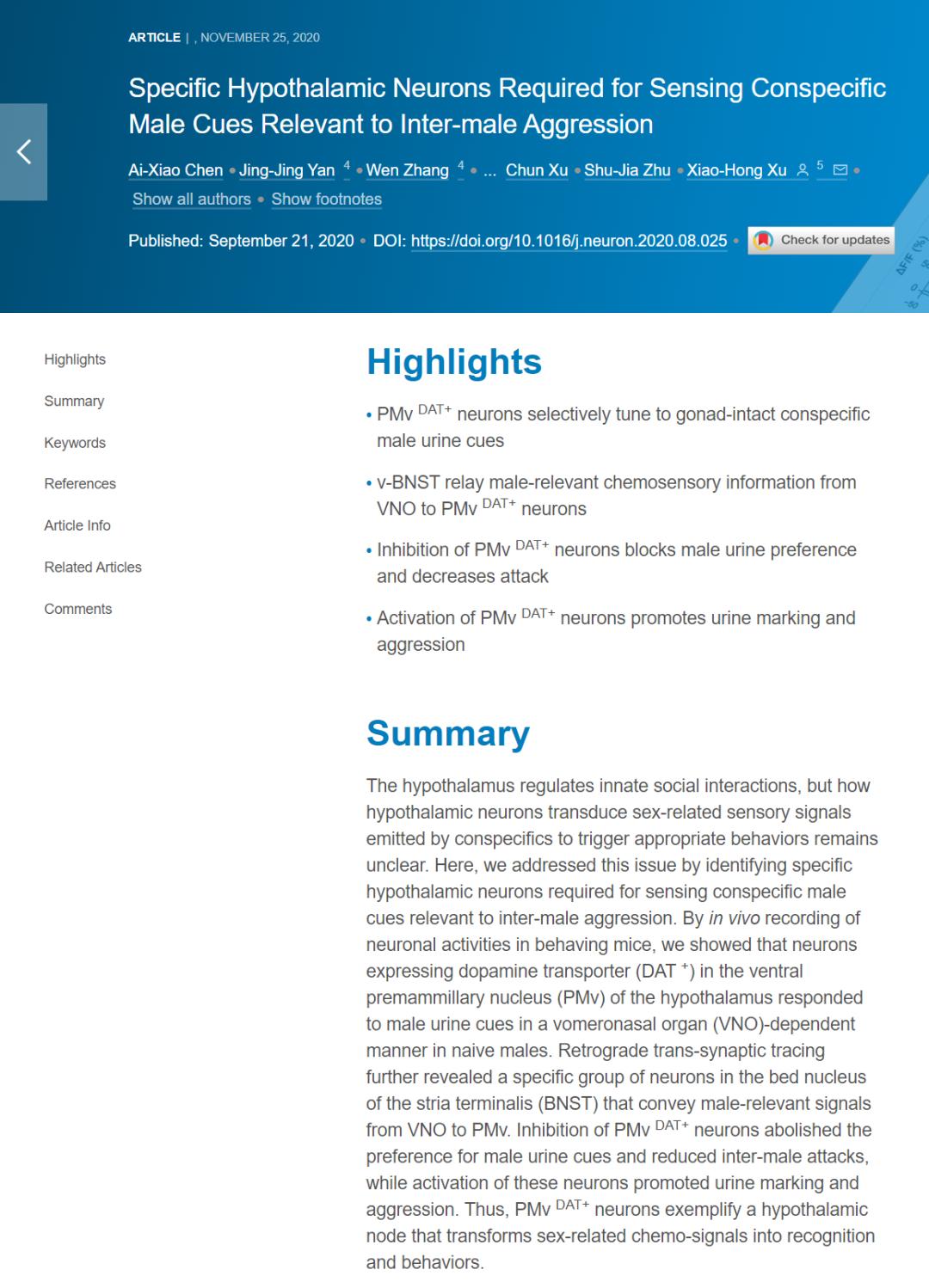 文獻(xiàn):Chen, Ai-Xiao, et al. "Specific Hypothalamic Neurons Required for Sensing Conspecific Male Cues Relevant to Inter-male Aggression." Neuron 108.4 (2020): 763-774.