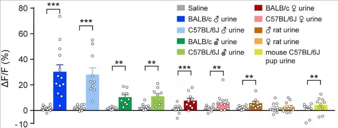 研究者讓沒有交配經(jīng)歷的“處男鼠”分別去嗅性腺完好的雄性小鼠、去勢雄性小鼠、雌性小鼠、幼鼠、雄性或雌性大鼠(大鼠會(huì)捕食小鼠)的尿液,和作為對照的生理鹽水,同時(shí)通過鈣信號(hào)記錄技術(shù)(fiber photometry)記錄PMv????神經(jīng)元的活動(dòng)情況。他們發(fā)現(xiàn),PMv????神經(jīng)元對各種尿液的反應(yīng)普遍高于生理鹽水,尤其對性腺完好雄性小鼠尿液的反應(yīng)強(qiáng)度竟然是其他尿液的3至5倍。而相比于雄鼠,雌鼠似乎對不同的尿液并沒有特別明顯的選擇性。也就是說,“處男鼠”的PMv????神經(jīng)元,似乎能特異性地“嗅出”同類雄性小鼠的尿液信號(hào)。
