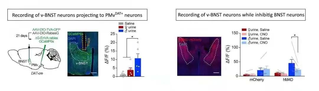 左:投射到PMv????的v-BNST神經(jīng)元在嗅雄鼠尿液和雌鼠尿液時(shí)的鈣信號(hào)響應(yīng);