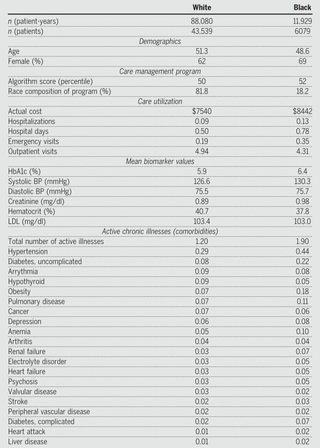 在這項研究中,研究人員利用了一個豐富的數(shù)據(jù)集,該數(shù)據(jù)集部署在全美國范圍內(nèi),每年應(yīng)用于大約2億美國人,大型衛(wèi)生系統(tǒng)依靠這種算法將患者篩選為“高風險護理管理”(high-risk care management)項目的補助對象。大多數(shù)衛(wèi)生系統(tǒng)將這些項目作為人口健康管理工作的基石,它們被廣泛認為能夠有效提高健康管理結(jié)果和滿意度,同時降低成本。