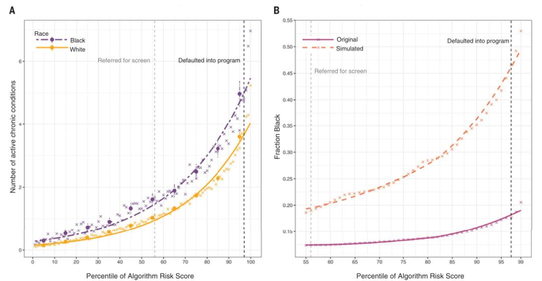 預(yù)測差異對患者意味著什么呢?算法分數(shù)是決定患者未來是否參加護理項目的關(guān)鍵因素。因此,正如研究者所料,健康程度較低的黑人與健康程度較高的白人的風險得分相近,這就是項目篩查中存在重大偏差的證據(jù)。