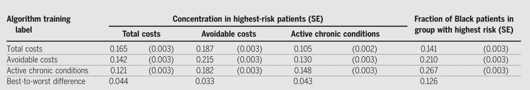 上述的研究發(fā)現(xiàn)強調(diào)了選擇算法所基于的標簽的重要性。一方面,算法制造商預(yù)測未來成本的選擇是合理的:該計劃的目標,至少部分是為了降低成本,并且有理由認為未來醫(yī)療成本最大的患者可以從該計劃中獲得最大的利益。另一方面,未來成本絕不是唯一合理的選擇。例如,護理管理項目的證據(jù)表明,它們并不是為了在全球范圍內(nèi)降低成本。相反,這些項目主要致力于防止導(dǎo)致災(zāi)難性衛(wèi)生保健利用的急性健康代償失調(diào)(事實上,它們實際上致力于增加其他類別的成本,如初級保健和家庭衛(wèi)生援助)。因此,可避免的未來費用,即與急診和住院相關(guān)的費用,可能是一個有用的預(yù)測標簽?;蛘?,與其預(yù)測成本,也可以簡單地預(yù)測一個健康指標,如活躍的慢性健康狀況的數(shù)量。因為該項目最終旨在改善這些疾病的管理,與他們接觸最多的患者也可能是一個有希望部署預(yù)防性干預(yù)措施的群體。