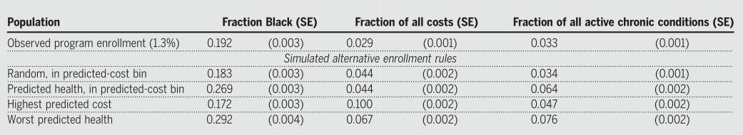 表3顯示了參加該計劃的人員的統(tǒng)計數(shù)據(jù),占觀察樣本的1.3%:參加計劃的人員中有19.2%是黑人(而整個樣本中有11.9%是黑人),占所有費用的2.9%,占整個樣本中所有活動慢性病的3.3%。然后研究進行了四次反事實模擬,這些模擬僅使用可觀察的因素,而不是許多未觀察到的也影響注冊的行政和人為的因素。首先,實驗在原始算法預(yù)測的風險區(qū)間的每個百分位數(shù)內(nèi)計算實際的項目注冊率,并在每個風險區(qū)間中隨機抽取患者進行注冊。該模擬模擬了以算法分數(shù)為條件的“種族盲”注冊,會產(chǎn)生18.3%的黑人注冊人口(而觀察到的比例為19.2%;P = 0.8348)。第二種方法不是進行隨機抽樣,而是在一個風險區(qū)間內(nèi)對那些活動期慢性疾病預(yù)測數(shù)最高的患者進行抽樣(使用上述的實驗算法),這將產(chǎn)生26.9%的黑人人口。最后,實驗將以上兩種方案與簡單地將預(yù)測成本最高或活動慢性疾病數(shù)量最高的患者分配到該計劃(也使用上述算法)進行比較,這將分別產(chǎn)生17.2%和29.2%的黑人患者。因此,盡管醫(yī)生確實糾正了算法的一小部分偏差,但他們貢獻的程度遠遠少于因為使用不同標簽訓(xùn)練算法而造成的偏差。