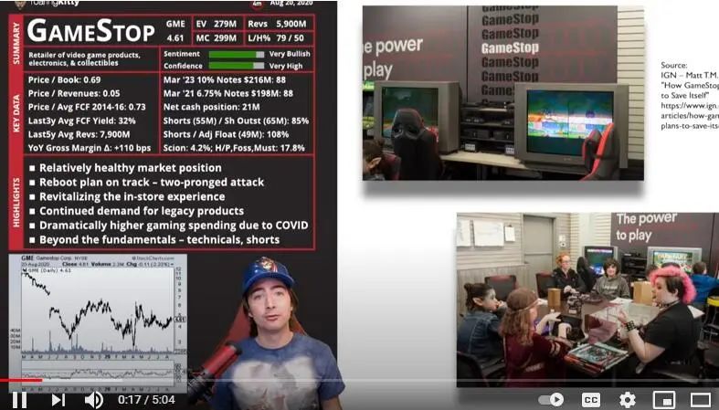Gill在YouTube上有個名叫Roaring Kitty(中文可譯為“咆哮Kitty”)的賬號,名字看起來可能有女兒的影響。它的最近一個熱門視頻是五個月前發(fā)布的,分享他個人看好GME的分析,題為“從5美元到50美元大逼空?GME可能漲得更高嗎?”,目前收獲4600點贊。