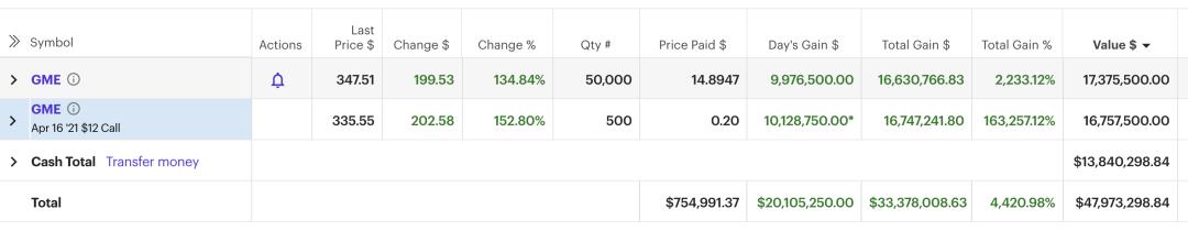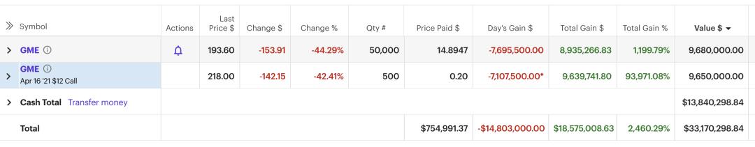 華爾街日報稱,到周四收盤后,Gill的E*Trade經(jīng)紀賬戶持有約3300萬美元,其中包括GME的股票、期權(quán)以及幾百萬美元的現(xiàn)金。