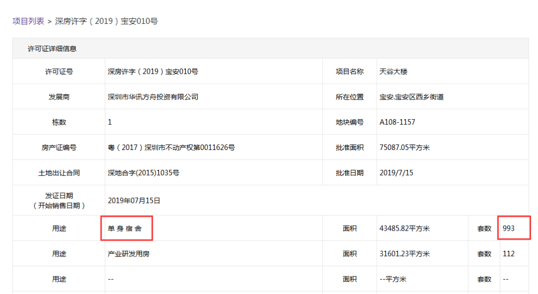這一次爆雷的項目名叫天谷大樓,深圳住建局網(wǎng)站顯示,這一項目是由深圳市華訊方舟投資有限公司(下稱華訊投資公司)開發(fā)的,其中用途為“單身宿舍”,總套數(shù)為993套。