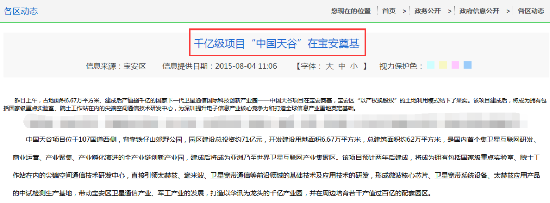 深圳寶安區(qū)對天谷項目同樣是寄予厚望,將這一項目稱為“千億級項目”,建成后將是國內(nèi)首個集衛(wèi)星互聯(lián)網(wǎng)研發(fā)、商業(yè)運營、產(chǎn)業(yè)聚集、產(chǎn)業(yè)孵化演進的全產(chǎn)業(yè)鏈創(chuàng)新產(chǎn)業(yè)園,建成后將成為亞洲乃至世界衛(wèi)星互聯(lián)網(wǎng)產(chǎn)業(yè)集聚區(qū)。