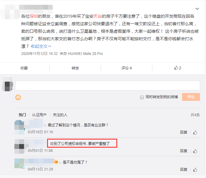 事實上,在2020年11月,就有購房者發(fā)布了微博,表達了對天谷大樓無法交付的擔憂。在這條微博下,也有人在今年5月1日時,稱已經(jīng)收到了公司債權(quán)申報書。