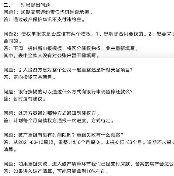 此外,網(wǎng)絡(luò)上還流傳著一份“天谷業(yè)主會議紀要”的文件,該文件顯示,如果華訊投資公司重組失敗進入破產(chǎn)清算,購房者將只能拿回10%的資金。