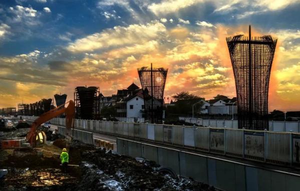 ▲ 晚霞映紅了西邊的天際,正在建設(shè)中的杭海城鐵鋼筋立柱在夕陽下更加雄偉壯麗。攝于2017年12月8日