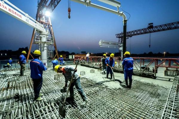 ▲ 夕陽下的奮戰(zhàn),城鐵建設(shè)者澆筑箱梁。攝于2018年4月17日