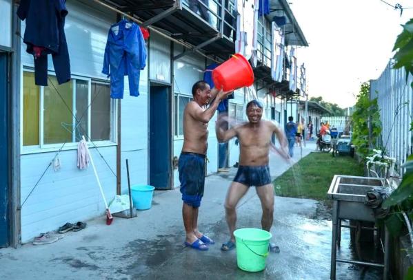 ▲ 辛勤勞作一天回到工棚,洗澡是工友們最放松的享受。攝于2018年7月14日