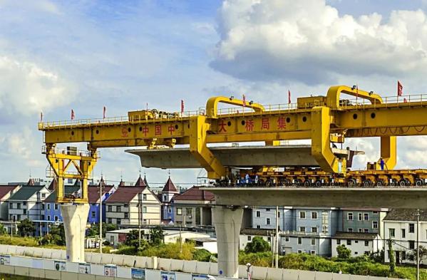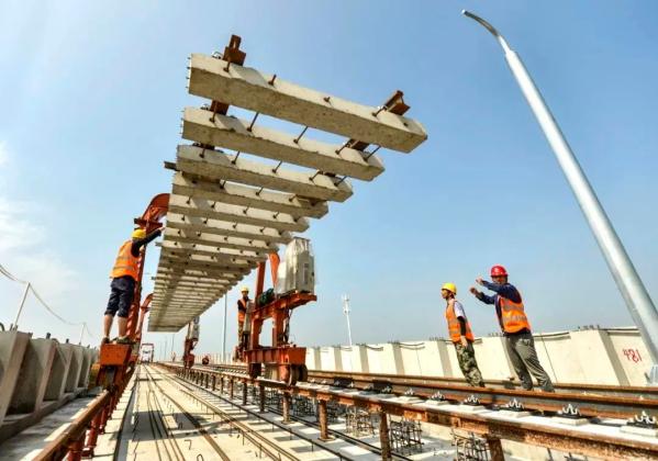 ▲ 架設(shè)箱梁。自2018年4月4日架設(shè)第一榀箱梁至2019年8月8日最后一榀箱梁第607榀箱梁架設(shè)完成,中鐵大橋局360多名工人經(jīng)過489天的奮戰(zhàn)取得階段性勝利。攝于2018年9月25日