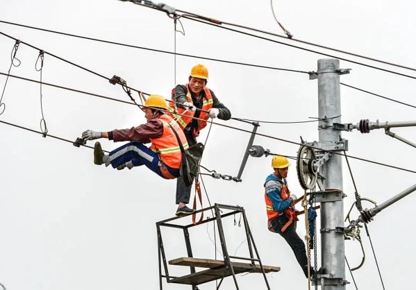 ▲ 空中漫步。最具危險(xiǎn)的高空架線,中鐵三局架線工臨危不懼。攝影2020年4月18日