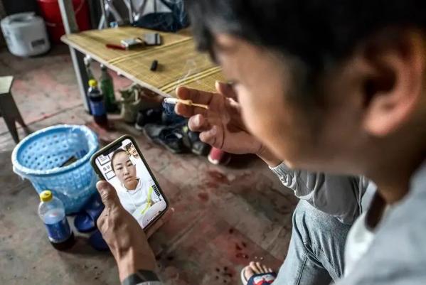 ▲ 由于疫情,來自湖北荊州的工友張林一一年多沒有回過家,工余時(shí)間和家人視頻連線。攝于2020年9月17日