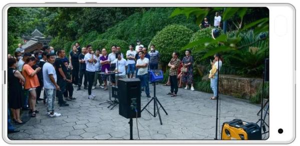 2020年7月,浙江海寧東山公園 | 傍晚的公園,一位新居民以現(xiàn)場K歌直播的形式與眾多網(wǎng)上粉絲互動(dòng)。