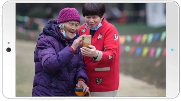 2021年2月,浙江海寧梅園公園 | 上了年紀(jì)的阿婆在家人的陪伴下游園,通過手機(jī)和遠(yuǎn)在國外生活的小孫女視頻聊天。