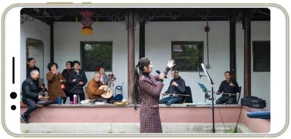 2021年4月,浙江海寧南關(guān)廂 | 午后,老年戲曲愛好者聚在一起;平時(shí)喜歡時(shí)裝走秀的小張現(xiàn)場直播,唱響《我愛你中國》。