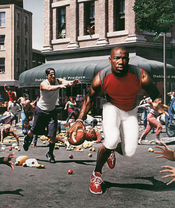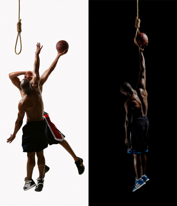 Strange Fruit 和B?anded是較晚的系列,把當代體育運動廣告和奴隸制歷史聯(lián)系了起來?;@球常被譽為是擺脫貧困獲得名利的門票,這些作品表明,在現(xiàn)代商業(yè)文化中,黑人男性身體產(chǎn)生巨大財富的同時,再次被商品化。“Strange Fruit”這個名字來自一位美國猶太人教師Abel Meeropol寫的關于私刑的詩,后來被Billie Holiday唱紅了。(私刑與奴隸制有關但也有必要區(qū)分開)黑色的軀體在奴隸市場、施以私刑的樹上、綁縛犯人的柱子上都是種景象,同樣在NCAA、NBA、NFL籃球賽場上。他們的祖先可能是被處死的,而勞作過的棉花地和煙草田變成了足球場地。他拍攝出了這種可能,以引導人們更好地思考現(xiàn)狀。“剝削是美國建國的基礎,可以更坦率地討論,NCAA是一個幾十億美金的業(yè)務,建立了奴隸后代的自由勞動力?!?/p>