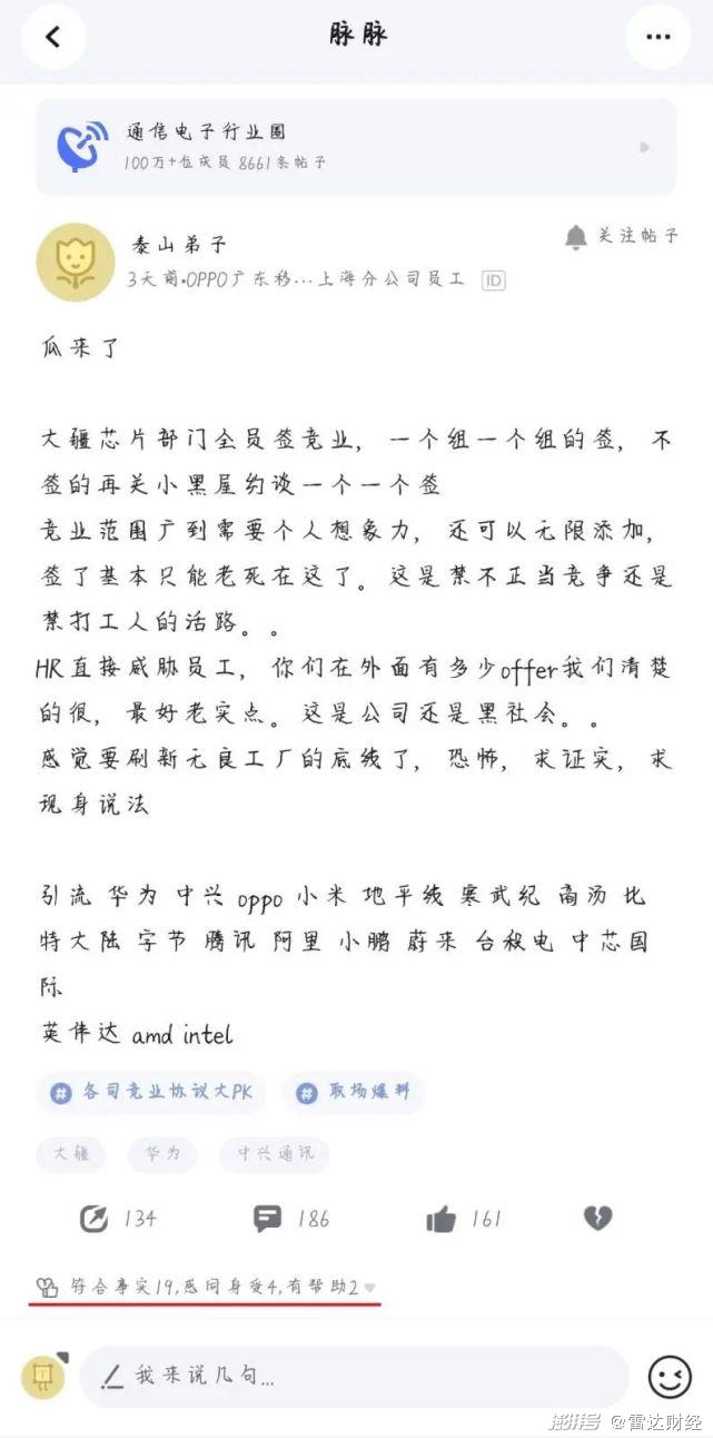 該話題下熱門帖子稱,“大疆芯片部門全員簽競(jìng)業(yè),一個(gè)組一個(gè)組的簽,不簽的再關(guān)小黑屋約談一個(gè)一個(gè)簽”。對(duì)于該帖有19人符合事實(shí),4人感同身受,2人有幫助。