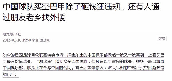 據(jù)德國足球數(shù)據(jù)網(wǎng)絡媒體《轉會市場》公布的數(shù)據(jù),在全球冬季轉會燒錢榜上,中超聯(lián)賽暫時以4112萬歐元排名第1位。巴西媒體驚嘆:財大氣粗的中超正買空日漸萎縮的巴甲。