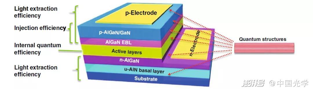 因此,為了獲得高外量子效率的深紫外LED器件,必須提高內(nèi)量子效率、載流子注入效率和光提取效率,特別是要解決量子能級(jí)間躍遷、載流子匹配、光子傳播等諸多關(guān)鍵技術(shù)難題和深層次的科學(xué)問題。
