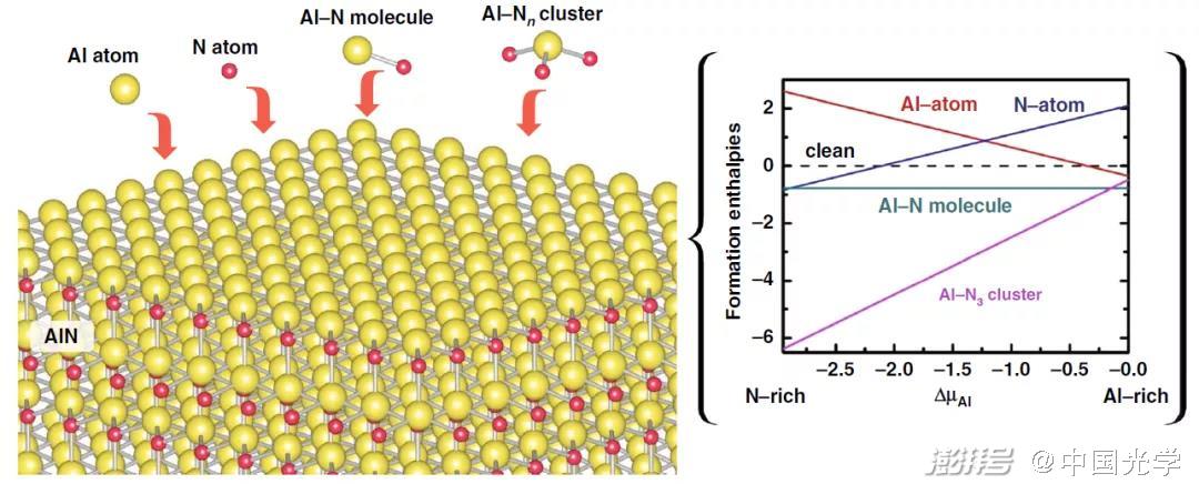 氮化物薄膜及其量子結(jié)構(gòu)通常采用金屬有機(jī)物化學(xué)氣相沉積(MOCVD)方法得以實(shí)現(xiàn),其生長(zhǎng)涉及非平衡條件下極其復(fù)雜的動(dòng)力學(xué)過程。如圖4所示,不同反應(yīng)單體的微觀生長(zhǎng)行為強(qiáng)烈依賴于化學(xué)勢(shì)。因此,通過晶體生長(zhǎng)表面的化學(xué)勢(shì)場(chǎng),實(shí)現(xiàn)對(duì)生長(zhǎng)單體的分選,可達(dá)到吸附單體的一致和原子級(jí)表面平整度,實(shí)現(xiàn)精細(xì)至單分子層的量子結(jié)構(gòu)外延。
