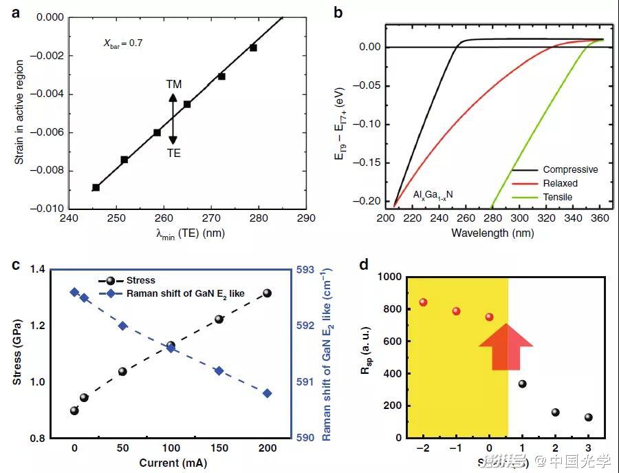 由于異質(zhì)結(jié)構(gòu)的存在,不可避免地存在晶格失配,產(chǎn)生失配應(yīng)變。近年來,人們通過各種技術(shù)來減少失配應(yīng)變,可概括為側(cè)向外延生長(zhǎng)法、多周期超晶格插入層法及基于二維材料的準(zhǔn)范德華外延法。在此基礎(chǔ)上,對(duì)AlGaN量子結(jié)構(gòu)的應(yīng)變場(chǎng)調(diào)控,可以在一定范圍內(nèi)調(diào)控能帶、量子能級(jí)躍遷和光發(fā)射(圖5)。最新進(jìn)展表明,控制高Al組分AlGaN量子結(jié)構(gòu)的應(yīng)變場(chǎng),可為器件橫電模式光發(fā)射比例和外量子效率的提高提供有效方法。