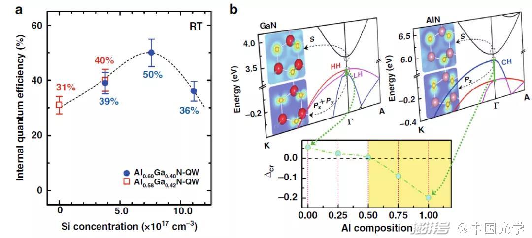 內(nèi)量子效率與有源層中的能帶結(jié)構(gòu)密切相關(guān)。為提高內(nèi)量子效率,人們通常減小量子阱厚度,使電子與空穴波函數(shù)的空間分離最小化;或者在量子阱中摻入適量的Si雜質(zhì),以屏蔽極化場(chǎng)(圖6a)。然而,高Al組分AlGaN的價(jià)帶頂主要由源自pz軌道貢獻(xiàn)的晶體場(chǎng)分裂(CH)帶占據(jù),而由px與py雜化軌道貢獻(xiàn)的重空穴(HH)帶和輕空穴(LH)帶則位居CH帶之下(圖6b)??梢灶A(yù)見,高Al組分AlGaN的價(jià)帶反轉(zhuǎn)現(xiàn)象,不僅對(duì)光子沿材料c軸方向的出光產(chǎn)生負(fù)面影響,且作為價(jià)帶頂?shù)腃H帶不受量子限域效應(yīng)的約束,制約了內(nèi)量子效率的提升。近期的文獻(xiàn)報(bào)道表明,px/py間的ppπ耦合有助于增強(qiáng)勢(shì)壘,pz軌道間的ppσ耦合則表現(xiàn)出相反的趨勢(shì)主導(dǎo)補(bǔ)償勢(shì)壘;不同取向晶面上生長(zhǎng)構(gòu)建量子阱結(jié)構(gòu)可調(diào)控軌道取向,改變軌道耦合附加勢(shì),從而增強(qiáng)量子結(jié)構(gòu)中的量子限域勢(shì)壘,提升輻射躍遷幾率。