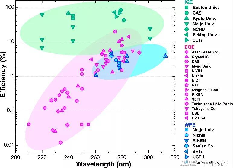 圖9. 國(guó)內(nèi)外主要研究機(jī)構(gòu)報(bào)道的紫外LED的IQE、EQE及WPE