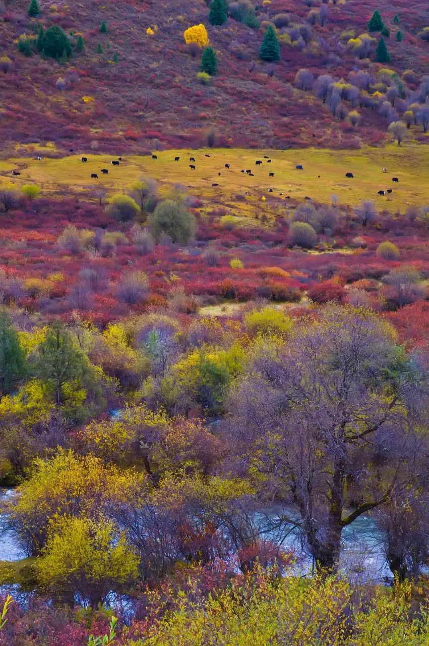 不同于其它的金黃,米亞羅經測是大于北京香山180倍的綿延紅葉海,但后期因為種類繁雜,也已經成為顏色兼具的彩林草甸。