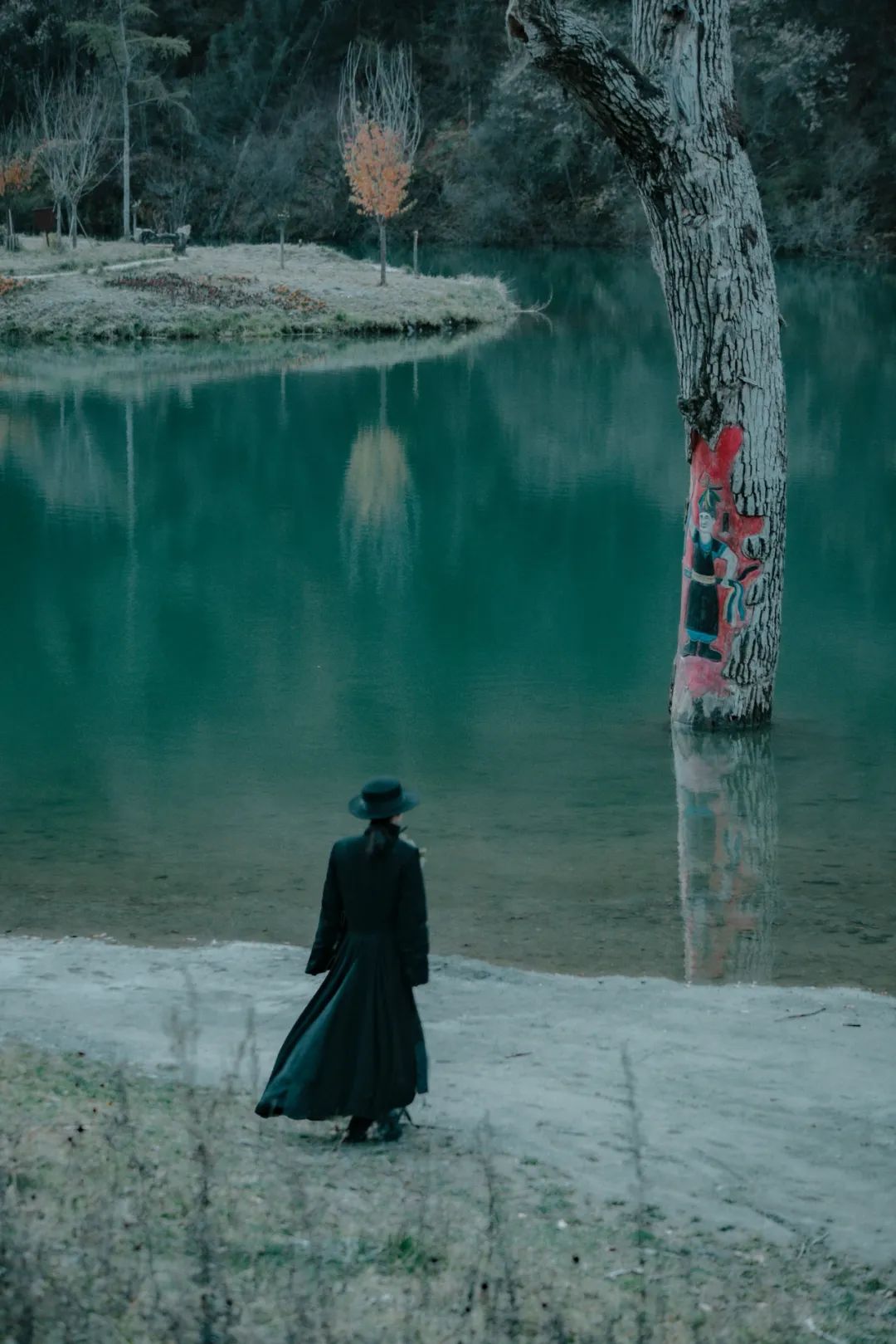 被彩林包裹,湖畔有不少枯死的樹干,當地居民在樹干上,繪制了信仰的圖騰。黑色的沙石,充滿神秘感…