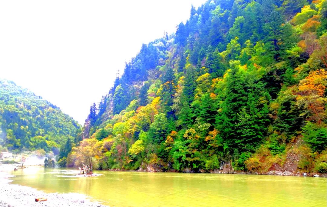 這里沒有人工種植,純天然的瘋狂生長,每年10月到11月上旬,紅楓、黃樺、墨松、橘林…會遍布整座山溝,染成獨一無二的彩虹色。