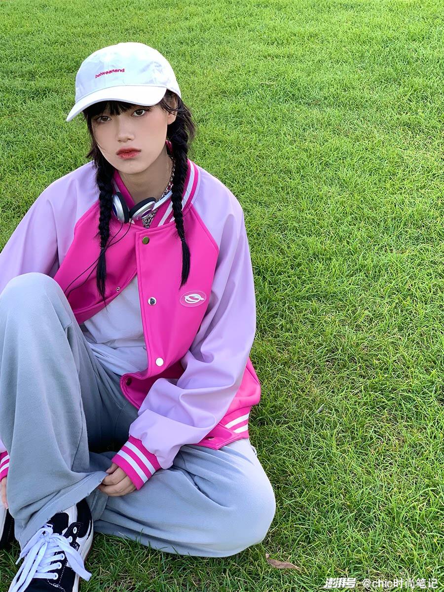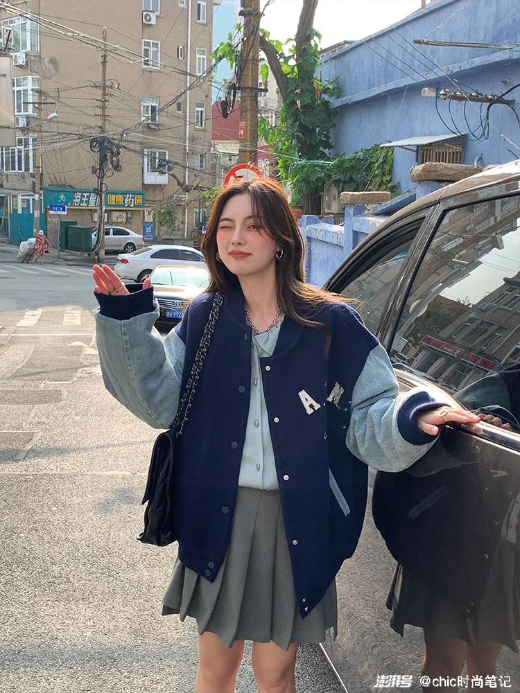 灰藍(lán)撞色的棒球外套,內(nèi)搭簡(jiǎn)潔的翻領(lǐng)襯衫,下面是一條灰色的百褶裙加持,既活潑又陽光,看起來太舒服了~