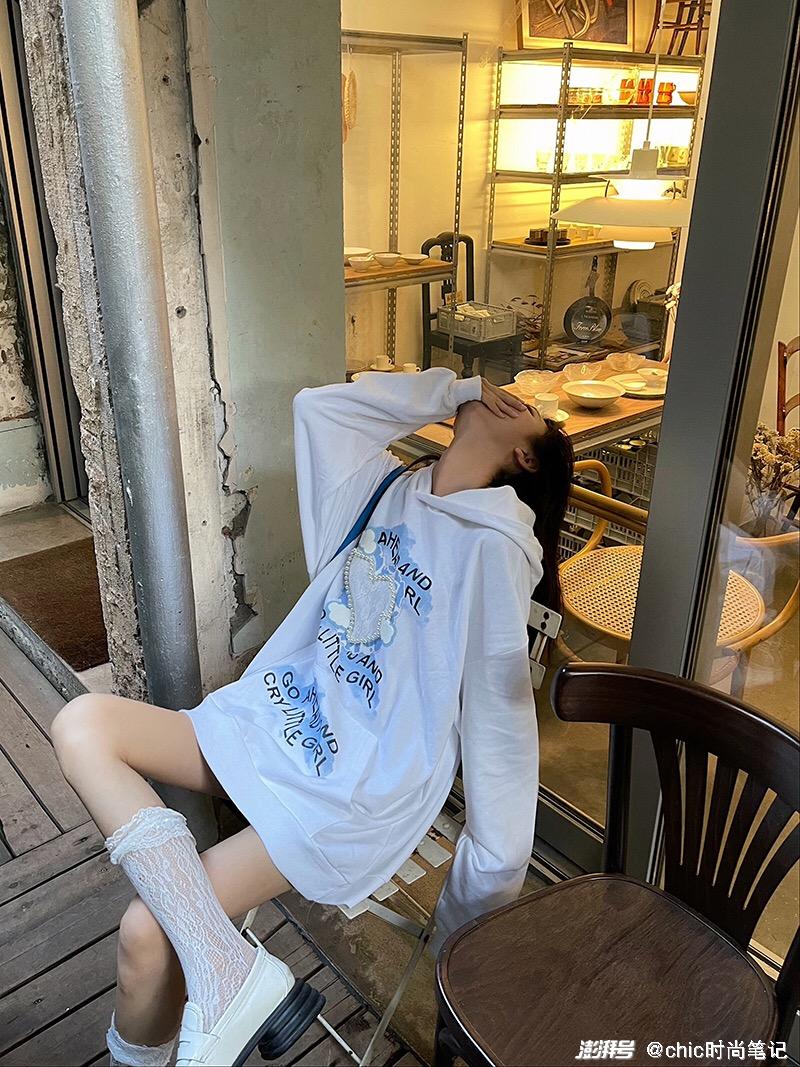 連帽的衛(wèi)衣利用下半身消失的穿法,搭配蕾絲中筒襪,顯腳踝細(xì)的方頭厚底皮鞋,整個(gè)人看起來真的是少女純欲風(fēng)滿滿,yyds了。