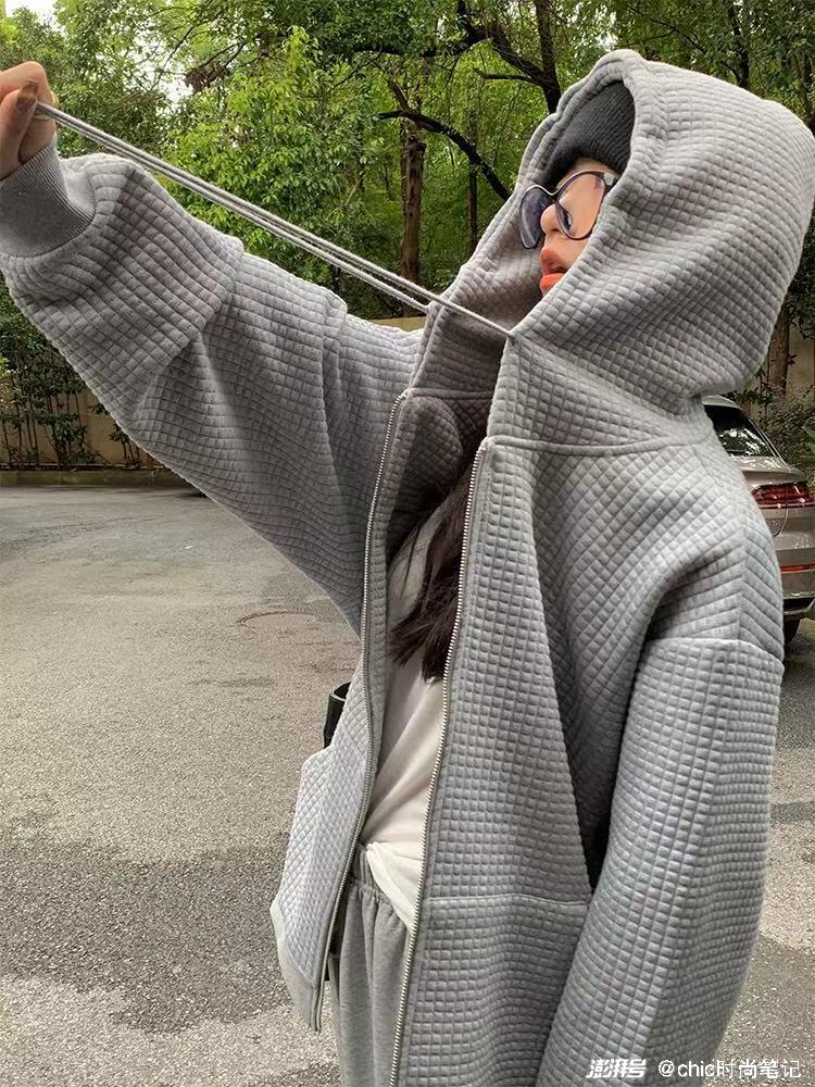 連帽開衫衛(wèi)衣也比較日?;?,內(nèi)搭一件簡(jiǎn)單的短袖就可以,而且降低了對(duì)身材的挑剔性,無論是高瘦矮胖都很合適,不是嘛~