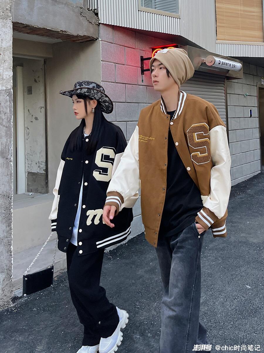 紅白撞色的字母棒球衫, Oversize的版型,滿足了大多數(shù)青年人趕時(shí)髦星球的渴望。內(nèi)搭簡(jiǎn)單的白T,情侶兩人就可以整整齊齊地出街了。