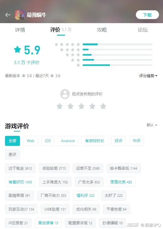 在玩家社區(qū)TapTap上,《最強(qiáng)蝸?!吩跐M分10分的情況下目前的評(píng)分僅為5.9分,而《提燈與地下城》的評(píng)分僅為5.3。