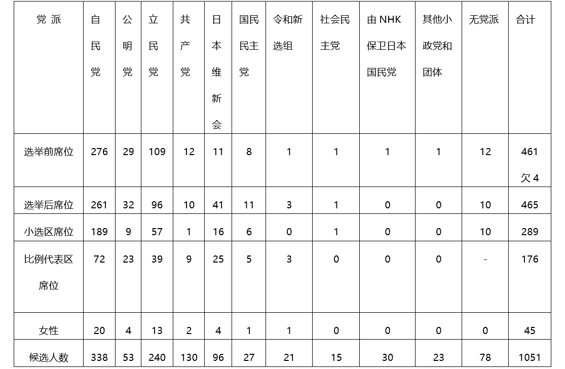 第一,主要政黨呈現(xiàn)“三增三減”局面。其中,議席減少的有自民黨、立憲民主黨和日本共產(chǎn)黨。議席增加新的有日本維新會、公明黨和國民民主黨。自民黨獲261席,比選前少15席,比上次大選少23席。具體來說,它在小選舉區(qū)的議席由218席減至189席,少了29席;比例代表區(qū)由66席增至72席,多6席;立憲民主黨則由110席跌至96席,減少14席,折合百分比是減少約12.7%;日本共產(chǎn)黨由12席減至10席,減少2席,約16.6%。