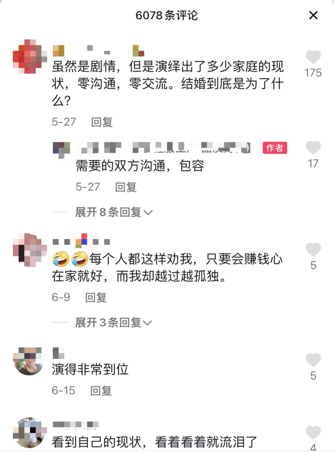 “雖然是劇情,但是演出了多少家庭的現(xiàn)狀,零溝通、零交流,結(jié)婚到底是為了什么?”