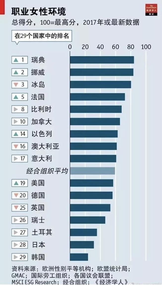 2014年經(jīng)濟合作暨發(fā)展組織(OECD)的統(tǒng)計的玻璃天花板指數(shù)(玻璃天花板指數(shù):用于測試各個國家和地區(qū)職場女性收到公平待遇程度的指數(shù)模型)顯示。