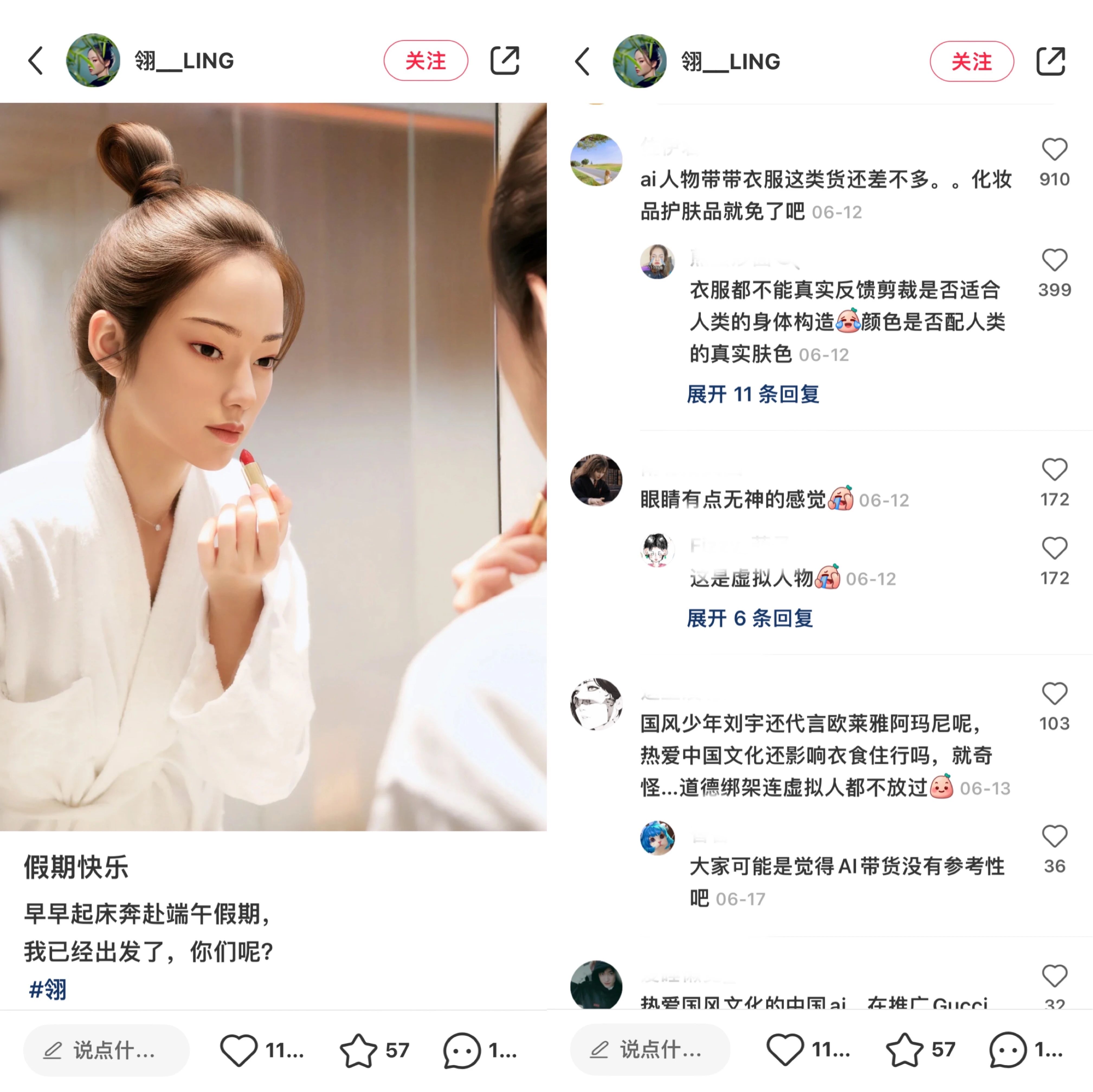 而因為還沒有立住人設(shè),數(shù)字人也很容易讓人無法信服其帶貨真實度。例如此前國風(fēng)虛擬偶像翎Ling曾在小紅書帶貨Gucci品牌的口紅,以“滋潤不干、珊瑚色調(diào)、草莓感覺”來形容產(chǎn)品。網(wǎng)友對此卻產(chǎn)生了異議,認(rèn)為虛擬偶像沒有真實體驗、消費過產(chǎn)品,AI人物帶貨沒有參考性。