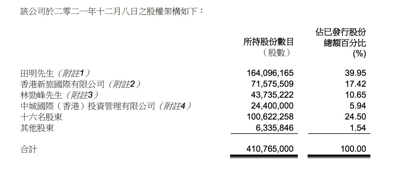 此外,有關(guān)股權(quán)連同由該公司一名控股股東及三名主要股東持有303806896股(占已發(fā)行股份的73.96%),相當于該公司于2021年12月8日已發(fā)行股份總額的98.46%。其中,控股股東田明個人持有164096165股,占已發(fā)行股份的39.95%。因此,該公司只有6335846股(占已發(fā)行股份1.54%)由其他股東持有。