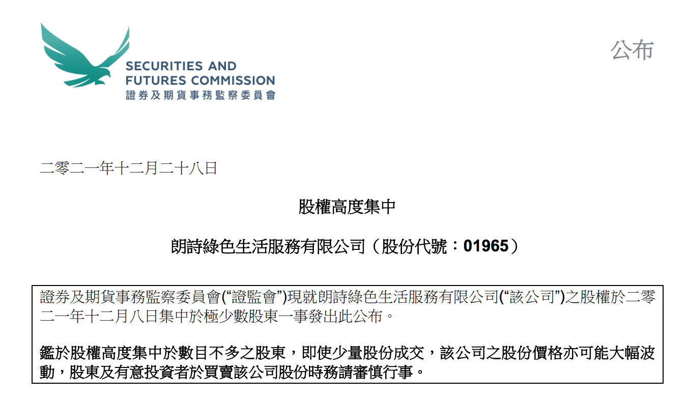 12月28日,朗詩綠色生活服務(wù)有限公司(01965.HK)公告顯示,證券及期貨事務(wù)監(jiān)察委員會(簡稱“證監(jiān)會”)就朗詩綠色生活服務(wù)有限公司的股權(quán)于2021年12月8日集中于極少數(shù)股東一事發(fā)出公告。