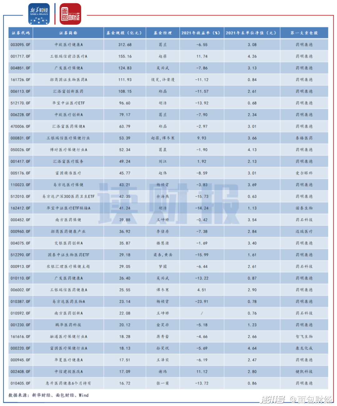 收益率排在倒數(shù)前三位的基金分別為易方達醫(yī)藥生物A、民生加銀醫(yī)藥健康、前海開源醫(yī)療健康A(chǔ),2021年分別虧損23.91%、22.35%和21.28%。截至2021年末,易方達醫(yī)藥生物A、民生加銀醫(yī)藥健康的單位凈值已分別跌至0.78和0.80。2021年12月,民生加銀醫(yī)藥健康公告基金經(jīng)理變更,該基金原經(jīng)理高松離任,陳潔馨新任基金經(jīng)理。