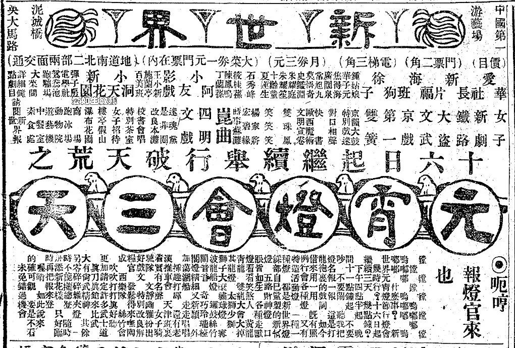 1920年3月6日《申報》刊登的新世界元宵燈會廣告