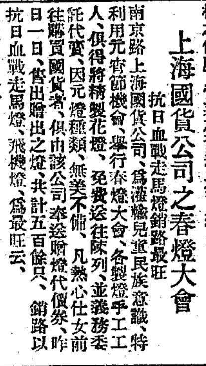 比如這則題為“上海國貨公司之春燈大會”的短消息中就提到:“抗日血戰(zhàn)走馬燈銷路最旺。南京路上海國貨公司、為灌輸兒童民族意識,特利用元宵節(jié)機會,舉行春燈大會,各制燈手工工人,俱得將精制花燈,免費送往陳列,并義務委托代賣,因元燈種類,無美不備,凡熱心人士前往購買國貨者,俱由該公司奉送贈燈代價券,昨日一日,售出贈出之燈,共計五百余只,銷路以抗日血戰(zhàn)走馬燈、飛機燈、為最旺云”