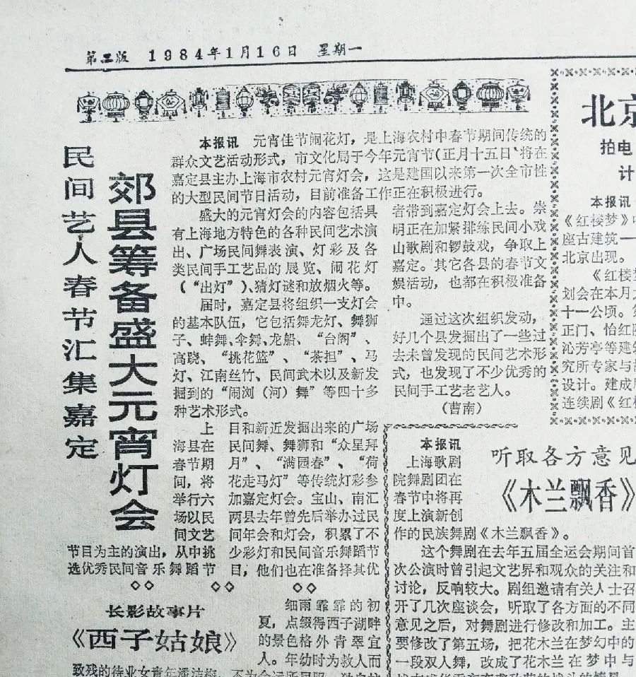 1984年1月16日《新民晚報》第2版刊發(fā)“郊縣籌備盛大元宵燈會”一文