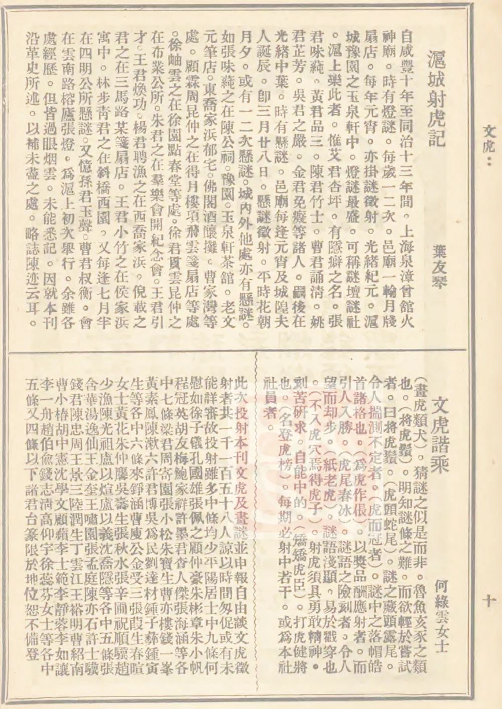 1930年1月1日,吳蓮洲與曹叔衡等在上海創(chuàng)辦中國最早的一本專業(yè)性謎語雜志——《文虎》,邀請了40多位愛謎文人擔任撰述者。海上知名謎家葉友琴在這本雜志刊發(fā)“滬城射虎記”一文,對滬上猜謎盛況有著較為詳細的記載?!白韵特S十年(1860)至同治十三年(1874)間,上海泉漳會館火神廟,時有燈謎,每歲一二次。邑廟(即老城隍廟)‘一輪月’箋扇店,每年元宵,亦掛謎征射。光緒紀元,滬城豫園之‘玉泉軒’中,燈謎最盛,可稱謎壇謎社……”