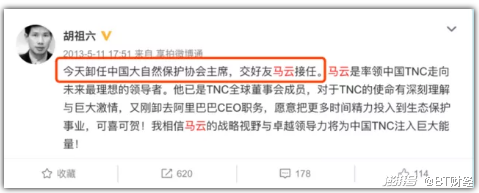 BT財(cái)經(jīng)仔細(xì)梳理胡祖六和馬云的關(guān)系發(fā)現(xiàn),在胡祖六把大自然保護(hù)協(xié)會(huì)中國(guó)主席讓給馬云之前,兩人并無(wú)太多交集,兩人關(guān)系升溫是在此之后,不僅僅是螞蟻森林的創(chuàng)立和春華資本入股螞蟻金服,后期兩人關(guān)系直接上升到戰(zhàn)略合作伙伴的關(guān)系。
